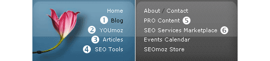 This is one of those techniques that's much easier to illustrate with an example. Let's say that we needed to dig deeply into SEOmoz's 12,000 indexed pages. The first thing that we might do is to take a look at the main navigation to get an idea of the URL/folder structure of the site. Looking at the top-right navigation on SEOmoz, we see the following (I've added the numbers 1-6 - see below):