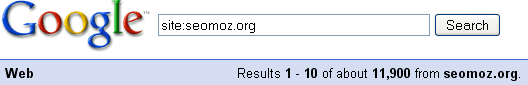 First off, you're going to need a couple of tools. I'll assume that most of you are familiar with Google's "site:" command, which returns the indexed pages from any given domain or subdomain. Let's take our friends here at SEOmoz as an example. Type "site:seomoz.org" into Google's search box, and you'll see something like this:
