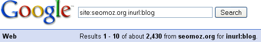 Using our SEOmoz example, how can we find out which pages are included in the roughly 12,000-page index when we can only see those pages 1,000 at a time? Those last three words are the key: we can only see 1,000 pages at a time, but depending on how we construct our searches, they don't have to be the same 1,000 pages. By splitting up our index searches logically, we can break the full index up into manageable chunks. We'll do this by using "inurl:" to force the "site:" command to show us the index through smaller windows.