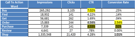 As you can see, the hypothesis was proven to be false. The word “Buy” has the highest CTR, but “Order” has a higher conversion rate. The word “Shop” has the second highest conversion rate.