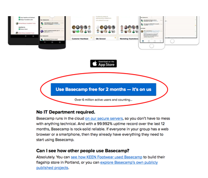 Basecamp is clearly telling you what you will get if you click on the button, creating value that is built on by including the number of users they currently have.