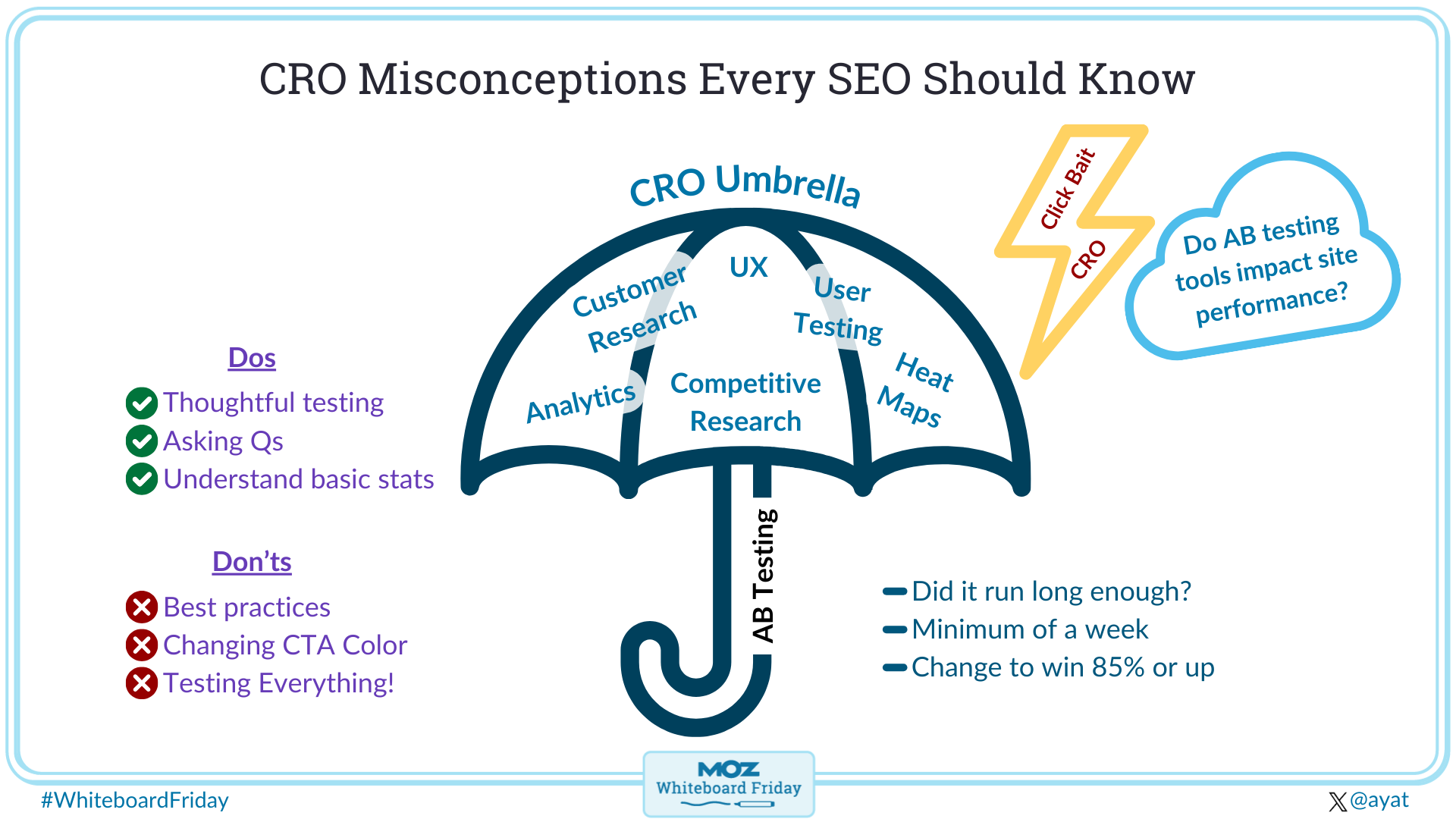 The other key thing is to remember CRO does not equal AB testing and vice versa. CRO, I like to always explain it, it's like kind of like the umbrella. It contains all of the different research areas, and I'm really looking into it. I'm digging into my customer research. I'm conducting interviews, I'm conducting user testing, I'm digging into analytics for insights. I'm looking at my competitors; what are they doing? Heat maps, session recordings, UX all of that is under the umbrella of CROs. So there's a lot of work that CROs actually have to do.