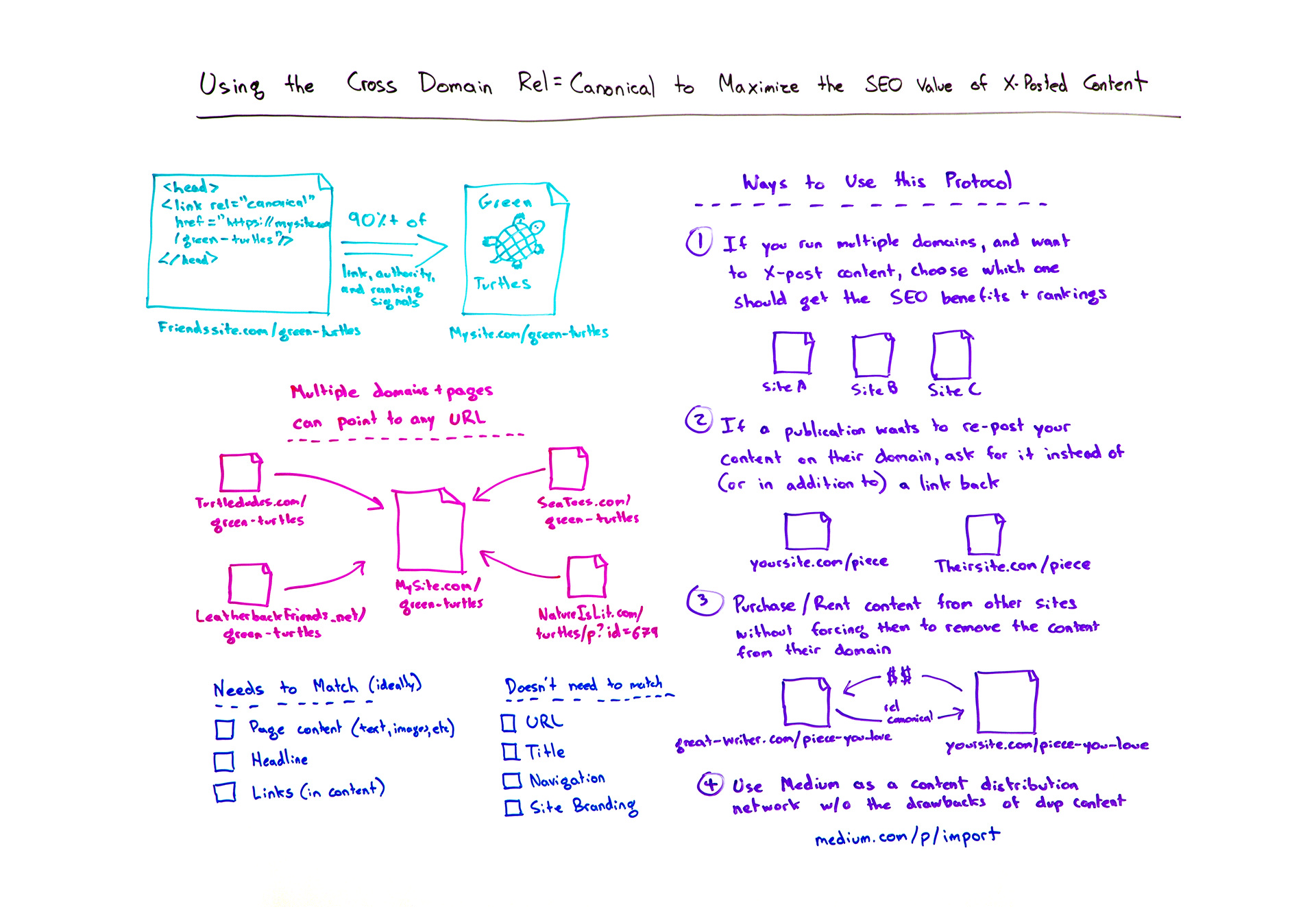 Same content, different domains? There's a tag for that. Using rel=canonical to tell Google that similar or identical content exists on multiple domains has a number of clever applications. You can cross-post content across several domains that you own, you can benefit from others republishing your own content, rent or purchase content on other sites, and safely use third-party distribution networks like Medium to spread the word. Rand covers all the canonical bases in this not-to-be-missed edition of Whiteboard Friday.
