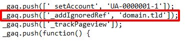 If you need to ignore multiple domains using ga.js or doubleclick.js tracking code, add multiple lines like this one. In either case, make sure that they come between the "setAccount" and "trackPageview" lines.