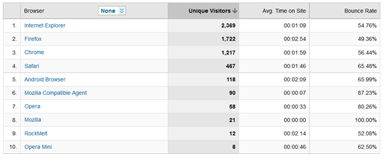 In the example above, #8 – the Mozilla browser – stands out from the rest of the browsers used to access the sample site. Chances are it isn’t a coincidence that none of the people who accessed your site with Mozilla found it unworthy of future exploration. It’s far more likely that usability problems interfered with your visitors’ enjoyment of your content!