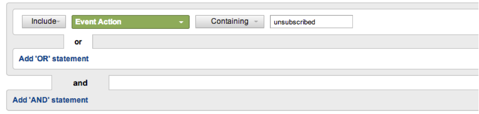 Once this is set up, you'll want to create an "unsubscribed" advanced segment in Google Analytics for the event name like that shown below in the example: