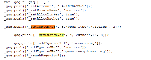 Depending on the type of site you have, it may or may not make sense to create segments based on whether your users are logged in or out. For example, you may have a different checkout process if you're logged in. Wouldn't it be nice if you could see the difference between conversion rates between logged-in and logged-out users? Or compare the behaviors of logged-in users compared to logged-out users? Thankfully, this is pretty easy to do. In fact if you look at the source code of this page, you can see how. Do a search in the source code for "setCustomVar" and you'll see what I mean. You'll see one of a few options but they will all follow a format like this: