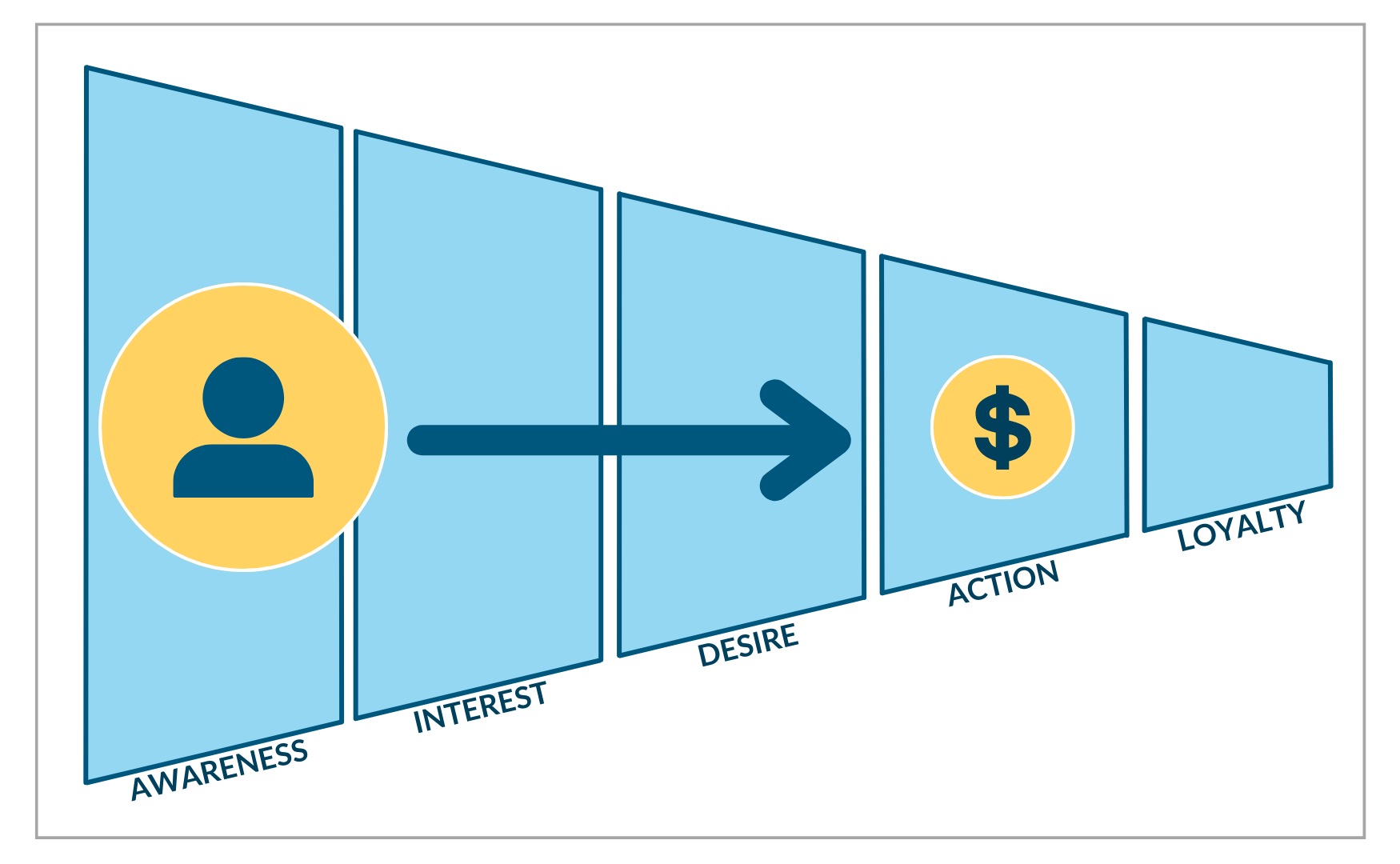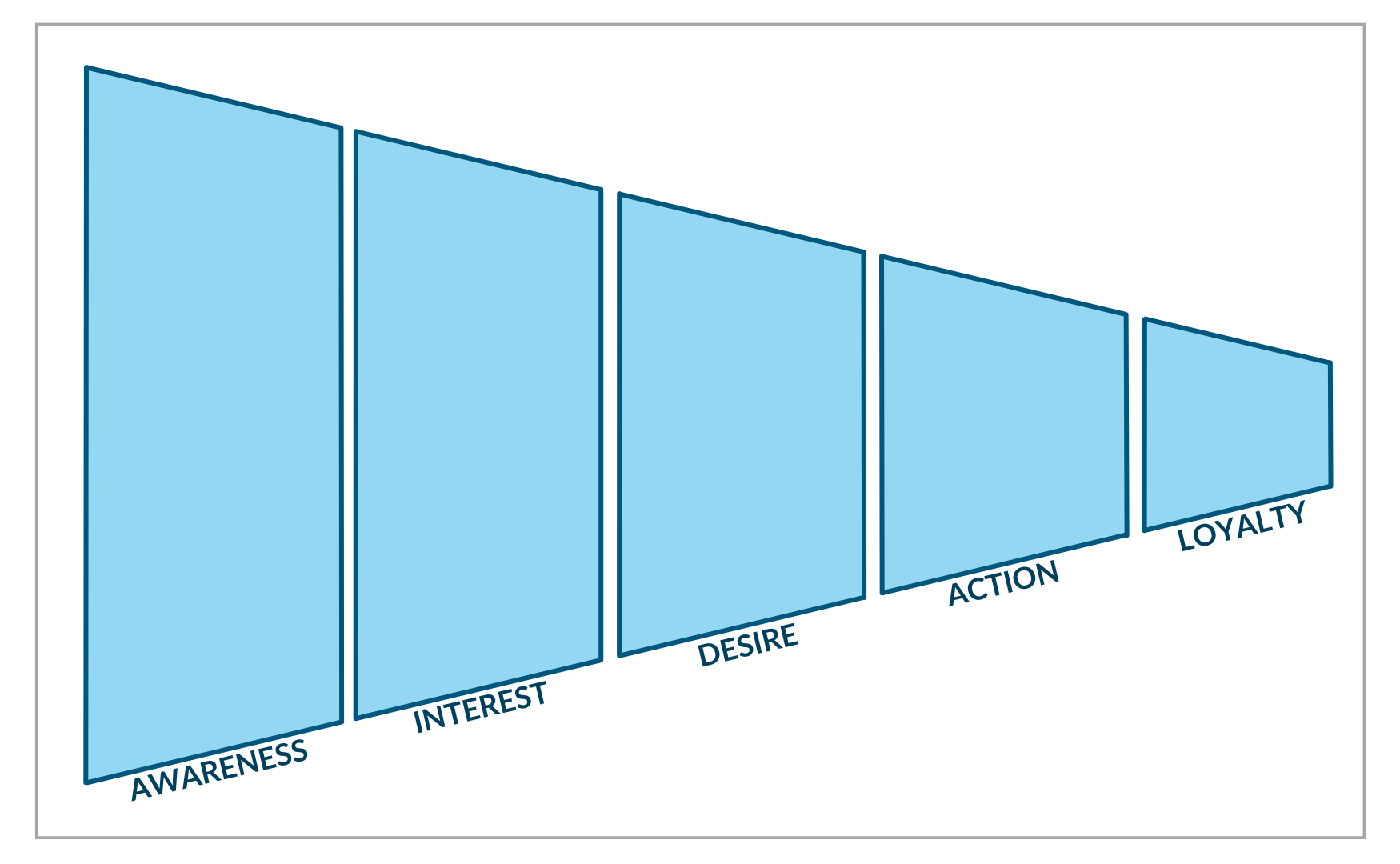There are many different customer journey models, but I prefer the classic AIDA model, adding the Loyalty stage at the end.