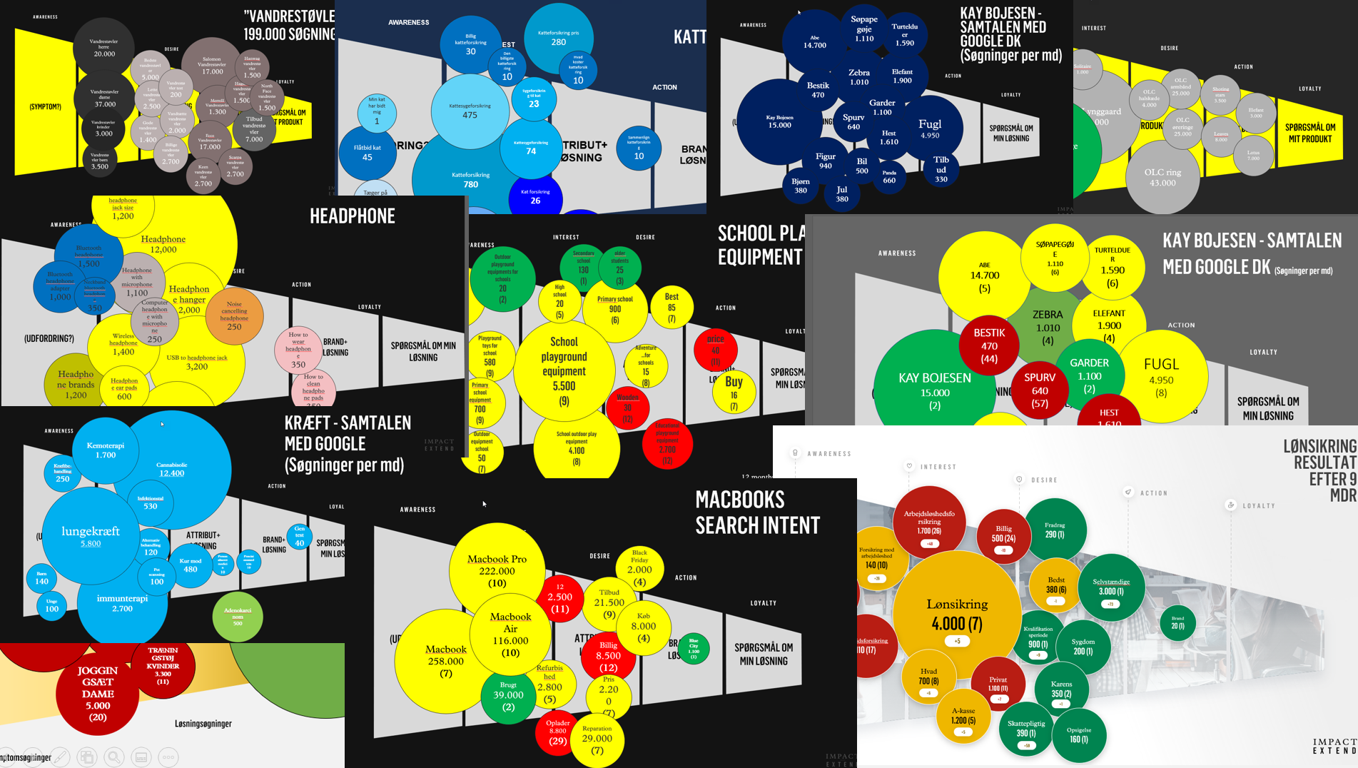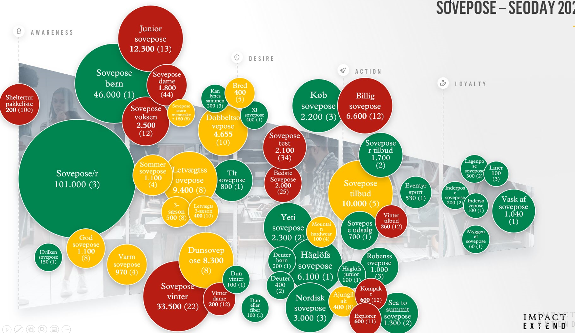 When I have completed this exercise I have a great understanding of the prospects’ conversation with Google. The next step is to insert the intents in PowerPoint, so it can be presented to the client. Here is an example. The traffic lights show how the site performs (Green = Rank 1-3 in Google. Yellow = Rest of page 1. Red = Page 2 or worse.). The size of the bubbles represent the search volume.