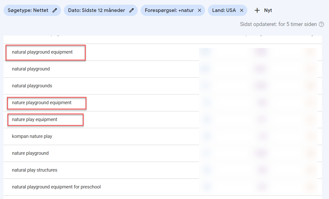 I will filter 12 months of data for a specific keyword. I will then go through my keyword list. In this example I am doing a map for “Natural playgrounds”. One intent is “natural playground equipment”. I have marked three queries below, which have the same intent: Natural playground equipment, Nature playground equipment and Nature play equipment.