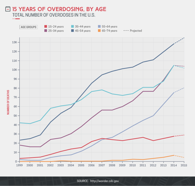 A key part of this visualization was adding one additional layer of complexity—age brackets—to tell a more contextualized and human story. Rather than simply presenting a single statistic, our team chose to highlight the fact that the increase in overdose deaths is something affecting Americans across the entire lifespan, and the effect of plotting six different lines on a single chart makes the visual point that addiction is getting worse for all Americans.