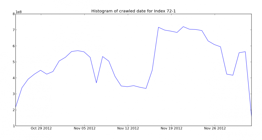 The histogram for the freshness of the index's crawl data shows a pretty high volume of fresh crawl data coming from middle of November. This index will have data ranging as old as the end of October, but a large volume of the data was crawled from the middle to end of November.