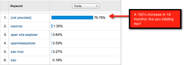 Then came Google Secure Search, and referral data got even more opaque. In addition to not knowing which Universal vertical the referral came from, now in about 10% of cases we didn’t even know the keyword that referred the traffic. The question that kept going through our collective ginger minds was: how can we help our clients with content strategy if we know nothing about WHY they are receiving said search traffic? Unfortunately, Secure Search has vastly expanded and now accounts for a large percentage of all Google referral traffic. As way of an example, here is the latest percentage of keyword = (not provided) for SEOmoz: