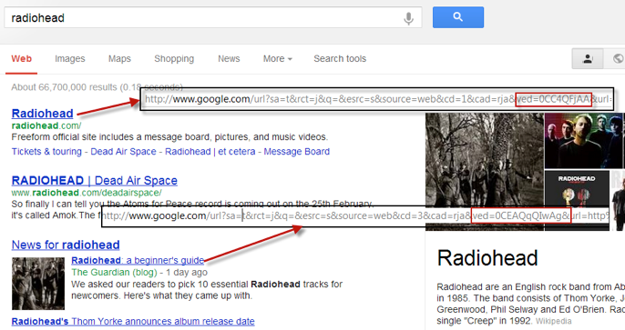 Simply, the Google referral string is the “href” value assigned to each URL in a set of search results. When a user clicks on the above, she is being redirected through a google URL prior to reaching her final destination; Radiohead.com, in this case. Google most likely does this for internal data aggregation reasons -- we’re not suppose to know where our traffic comes from, but they sure make use of it -- probably for aggregating data around SERPs.