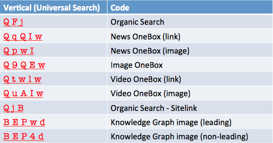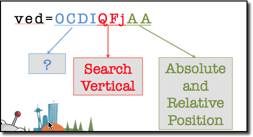 There are two parameters that I will focus on here: ‘cd’ and ‘ved.’ The ‘cd’ parameter has been written about before and tells us the position of the search result in the set. As far as I can tell, the ‘ved’ parameter is divided into three parts and tells us which Universal vertical the result is part of, the position within that vertical (relative position), and the position within the search result (absolute position). I will focus on just the Universal aspect for this post and will follow up with relative vs. absolute position in a follow-up.