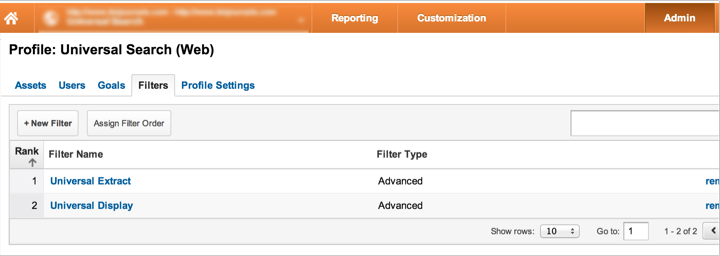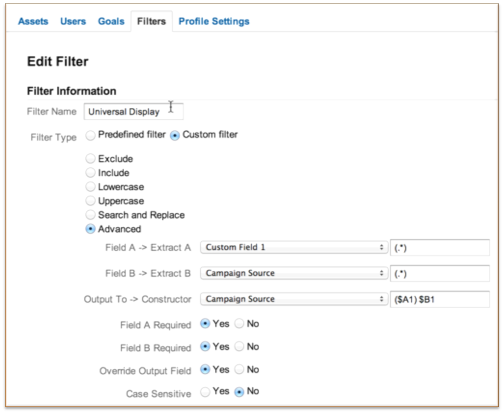 Go to the account’s administrative dashboard and select “New Profile.” I would recommend against setting this filter up on an existing profile as that it will overwrite some data that you otherwise want. I called mine ‘Universal Search.’