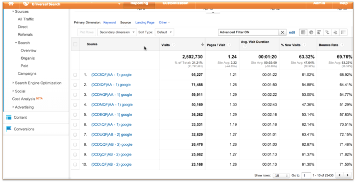 Matthew and I knew the only way to reclaim *some* of this lost data was to start looking at other sources. Luckily, Matt speaks Spanish (sort of) and came across this blog. The author posited that the 'ved' parameter in the Google referral string held some magic in determining the vertical that result appeared in. After doing some quick searches, and looking at the “href” values for the results, it seemed like he was onto something. We immediately set up Google Analytics profile filters to extract this parameter on a client that receives 300,000 search referrals from Google per day. After a couple of hours, we were loaded with enough data to start confirming some of the authors theories and coming up with a few of our own. I will layout what we found, provide a step-by-step tutorial to setup Google Analytics filters, and provide a few examples of how to use the data.