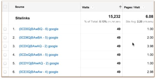 Another useful ‘ved’ to investigate is Sitelinks. Sitelinks are a subset of results triggered by a branded search. Google algorithmically determines which links to include, but webmasters have the ability to demote links in Webmaster Tools. The 'ved’ parameter can come in handy to measure performance of Sitelink pages and action can be taken. In order to figure out the Sitelink that sent the search referral, look at the ‘cd’ value that was passed with the referral string. We accounted for this in the filters and it is in your data here: