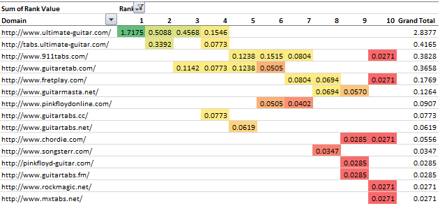 It's easy enough to see which sites are in the SERP and which rank higher or lower than your own site—just load up the search page! But often a site will have multiple pages listed in the SERP. So, on a per-search-term basis, I like to add these together per-site. Take the following SERP, which I put in a spreadsheet to make it easier to work with (check out Tom Critchlow's post if you'd like to speed up your own result scraping). The search is "the clash guitar tabs":