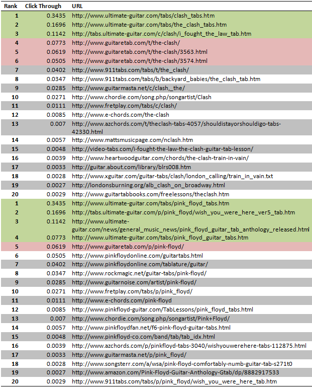...what if, instead of restricting myself to a single SERP, I was to aggregate data from multiple searches and sum the click-through rate for each domain across these searches? Searches for "the clash guitar tabs" and "pink floyd guitar tabs" are listed below, one atop the other. I've highlighted www.ultimate-guitar.com and www.guitaretab.com for reference:
