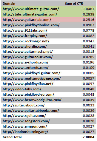 So I would say to myself at this point that www.ultimateguitar.com is receiving 51.31% of the traffic for this search query (or 62.73% if I wanted to include tabs.ultimateguitar.com in the figure). On the other hand, www.guitaretab.com, though occupying three places in the SERP as well, is receiving 18.75% of the traffic. Simple enough?