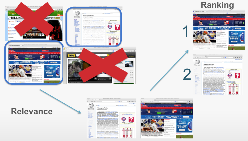 Conceptually, we can separate relevance determination from ranking the relevant documents, even if they are implemented as a single step inside a search engine. In this mental framework, the relevance step first makes a binary (True/False) decision for each page, then the ranking step orders the documents to return to the user.