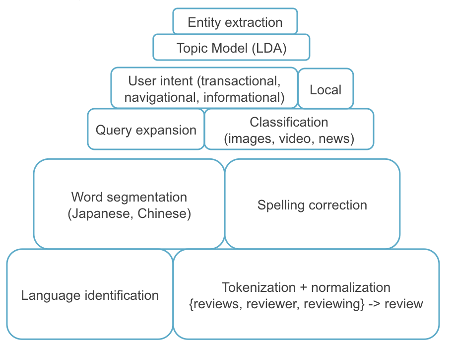The building blocks at the bottom include things like tokenization (splitting the string into words), word normalization (such as stemming where common word endings are removed), and spelling correction (if a query contains a misspelled word, the search engine corrects it and returns results for the corrected word).
