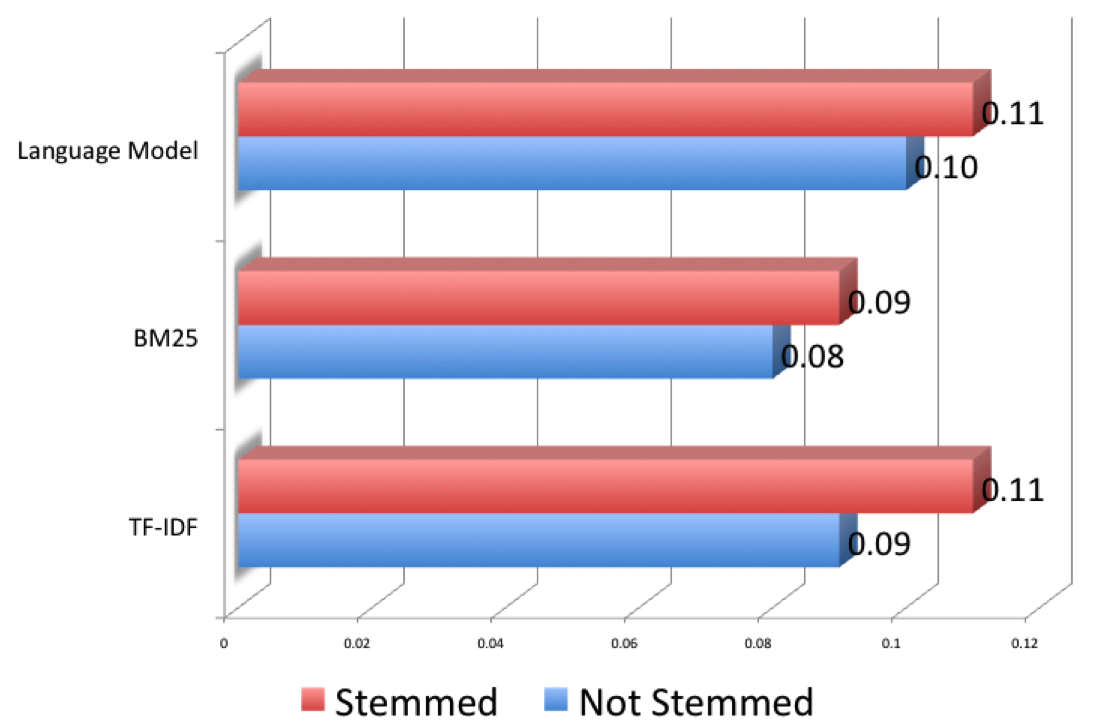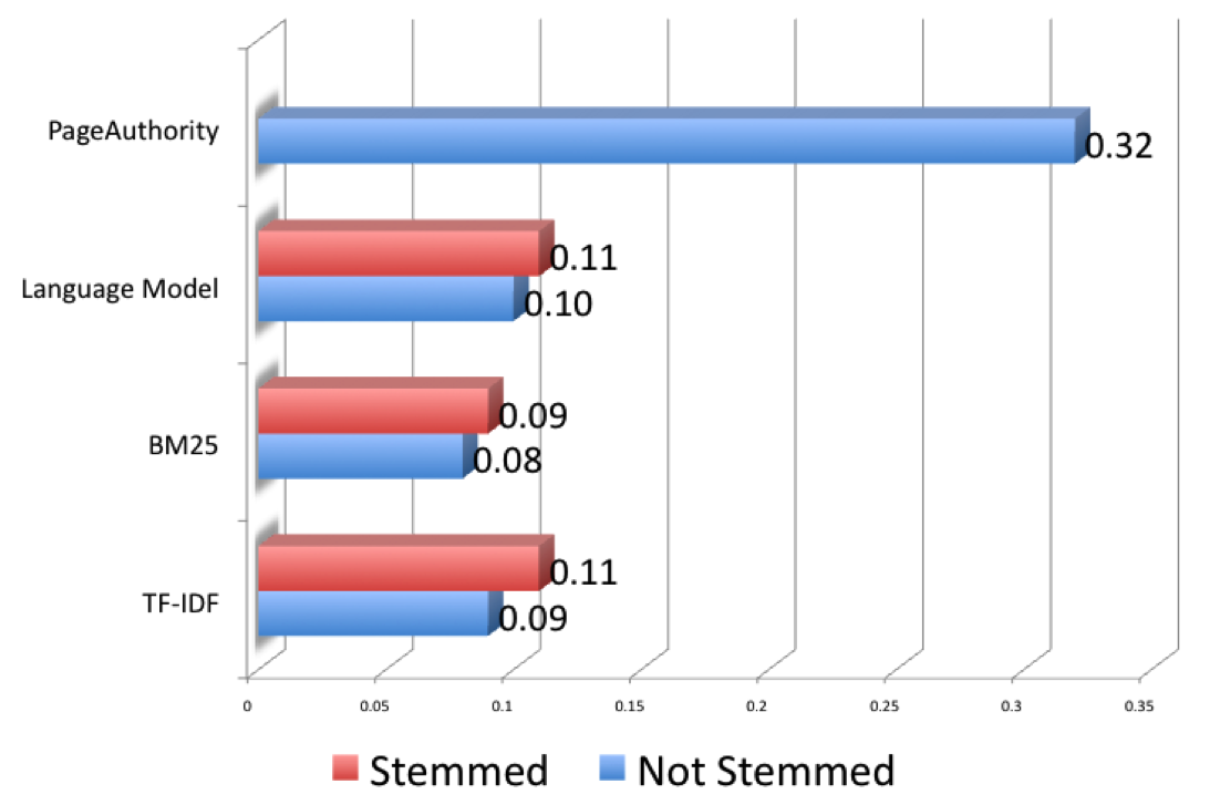 If we do some stemming of both the query and document first and recompute, the correlations increase slightly across the board: