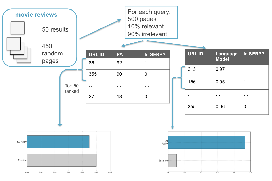 To run the experiment, I first took 450 random pages from our dataset stratified across the top 50 results (so that they include nine #1 ranked pages, nine #2 ranked pages, etc.). Then I added the 450 random pages to the top 50 pages in each search result to make one group of 500 pages for each keyword. Since 50 of these pages are in the search result, and 450 are not, 10% of them are relevant to the keyword and 90% are not (the assumption here is that if the page appears in a Google search then it is relevant). Then for each keyword, I collected the Page Authority and Language Model similarity score and sorted by each (the tables in the middle).