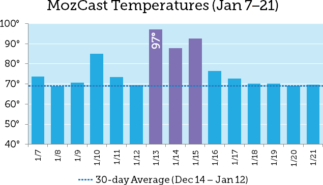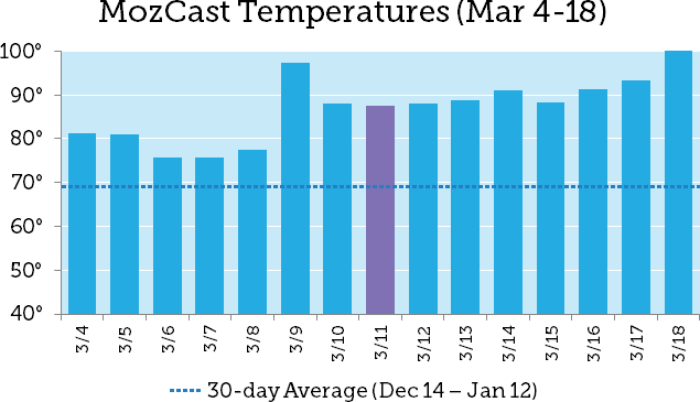 I've kept the same scale and 30-day average reference (from a relatively quiet period early this year). Note that algorithmic activity (i.e. ranking flux) is way up compared to the period before and after the January Core Update. One day (March 18) doesn't even fit on the scale of the original graph and came in at 104°F on MozCast.