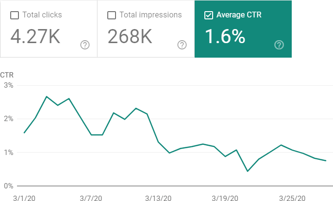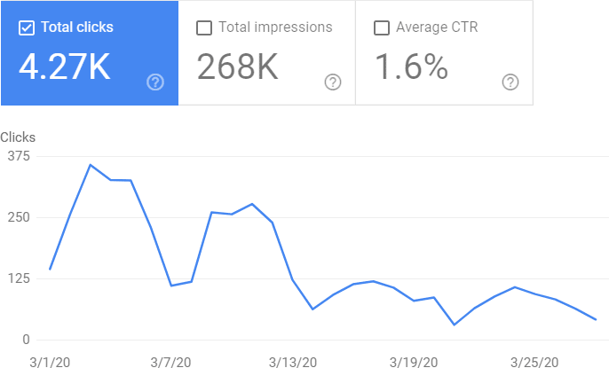 If traffic has dropped, but rankings haven't, it's also possible that the behavior of searchers has changed. We can get some insights into this by using Google Search Console. Here's the graph of total clicks for our example site from March 1-28 (corresponding with the GA data) ...