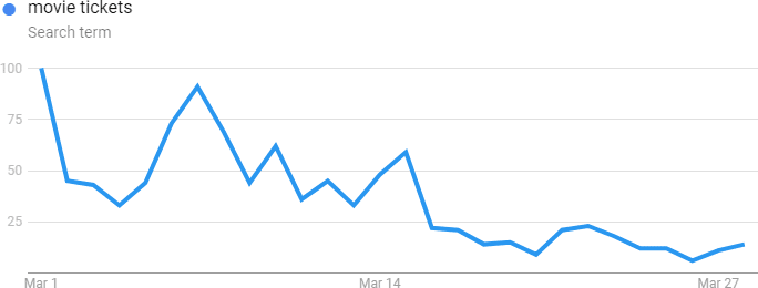 The Google Search Console data above has already suggested that we're seeing a shift in the wider world and searcher behavior, but if you want to get outside of your own data, you can explore the world a bit with Google Trends. For example, here's a Google Trends search for "movie tickets" for March 1-28 ...