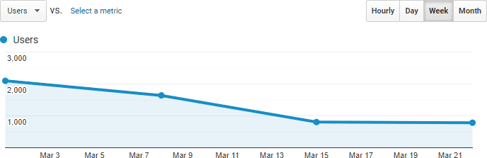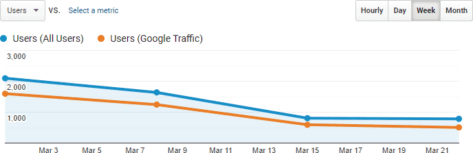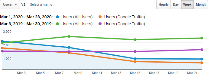 Using Google Analytics, let's consider some ways we can validate a traffic drop. Here's four weeks of GA data (March 1-28) for a site which was seriously impacted by COVID-19: