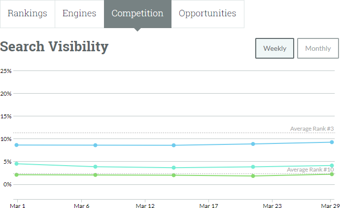 As a search marketer, and given that we've clearly measured a Google traffic drop, the next question is whether this drop was due to a loss of rankings (we'll get to other explanations in a moment). In Moz Pro, one quick way to assess overall weekly search visibility is to use either the main view under "Rankings" or go to the "Competition" tab. I like the competitive view, because you can quickly see if any changes impacted your broader industry ...
