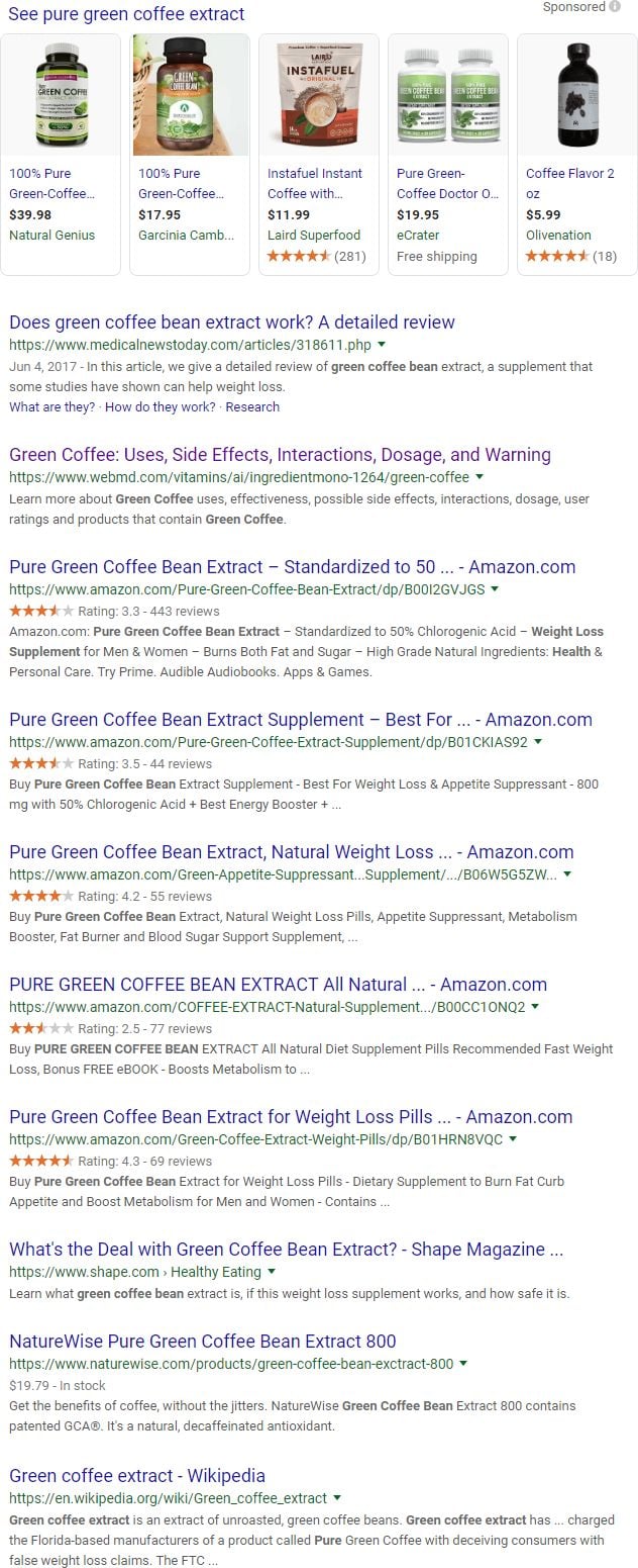When evaluating site diversity, we have to be careful relying too much on anecdotes. Anecdotally, there are definitely SERPs where a single domain seems to have too much power. For example, here's the main results column on a search for "pure green coffee extract" (I've removed a local pack for the purposes of this post):