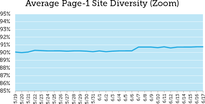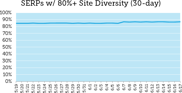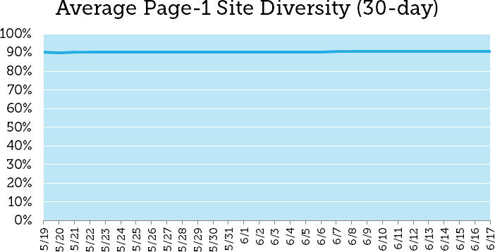 Using the 10,000-keyword MozCast set, we looked at the average diversity across page-one SERPs. Put simply, we measured how many unique sub-domains were represented within each results page. Since page one of Google can have less than ten organic results, this was expressed as a percentage — specifically, the ratio of unique sub-domains to total organic results on the page. Here's the 30-day graph (May 19 – June 17):