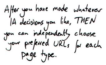 We need to not get those muddied, and I see that getting muddied too often. People talk about these decisions as if they're information architecture questions, and they make them first, when actually you should be making these decisions first and then picking the best, like I said, it's a bit more art than science sometimes to making the decision between longer URLs, more descriptive URLs, or shorter URL paths.