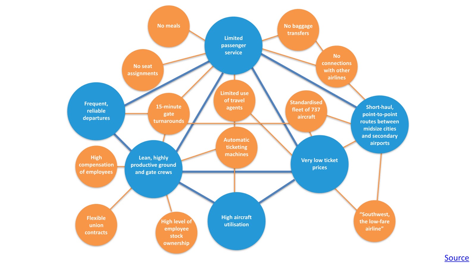 “Through fast turnarounds at the gate of only 15 minutes, Southwest is able to keep planes flying longer hours than rivals and provide frequent departures with fewer aircraft. Southwest does not offer meals, assigned seats, interline baggage checking, or premium classes of service. Automated ticketing at the gate encourages customers to bypass travel agents, allowing Southwest to avoid their commissions. A standardized fleet of 737 aircraft boosts the efficiency of maintenance.”