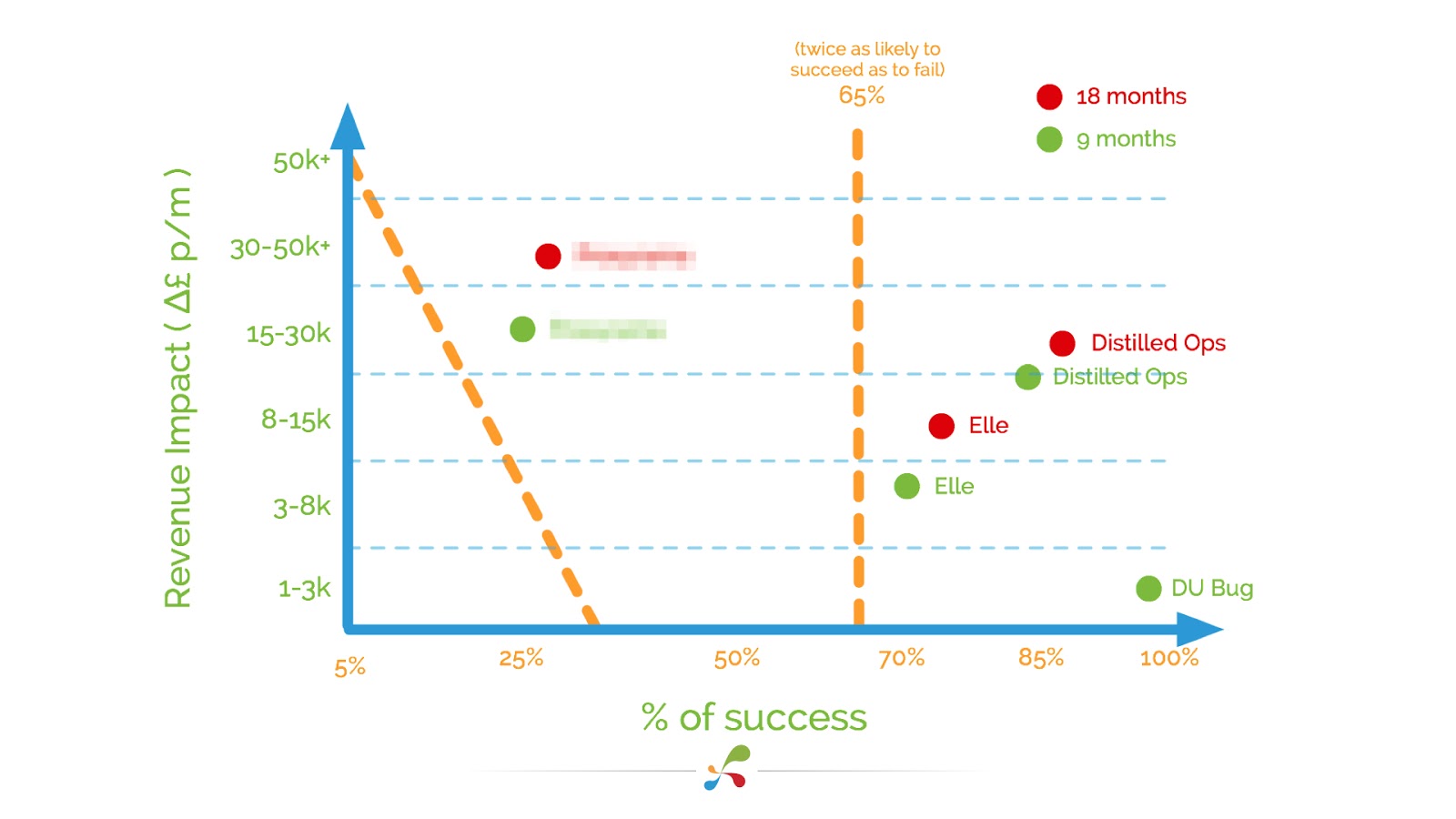 It’s possible, probably recommended, to have some mix of all three. I like the graph that our R&D team use to explain this, shown below. The idea is that there are always trade-offs between the chance of success and reward.