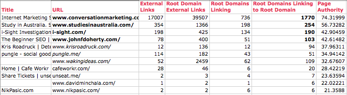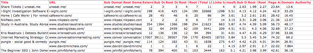 Ben actually built something like this for Distilled's use, and here is the output we get from it (copied and pasted into Excel).