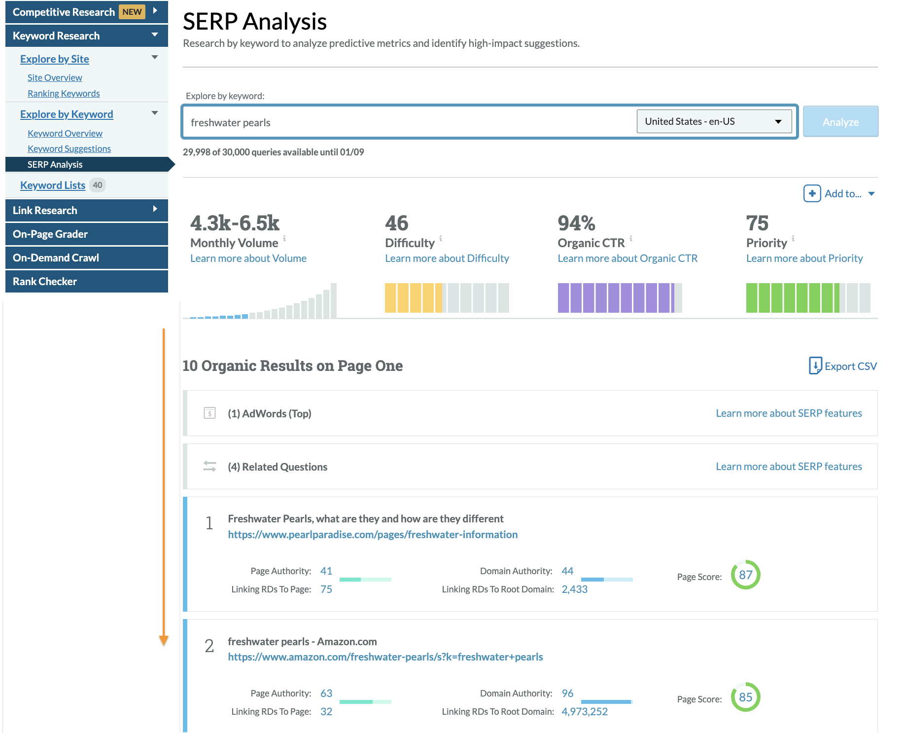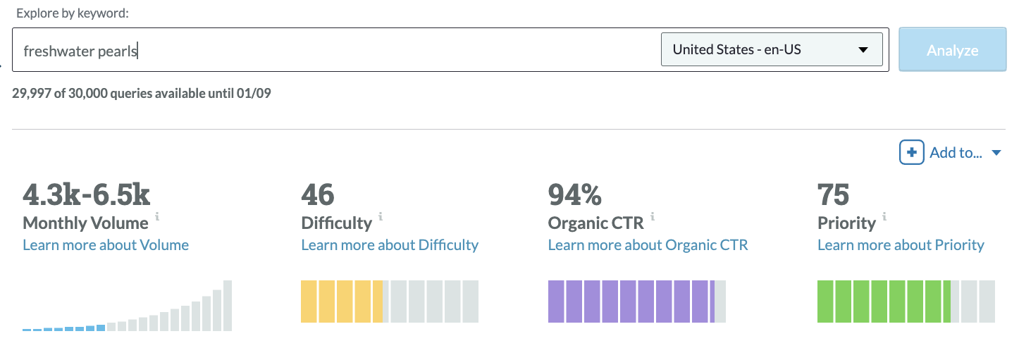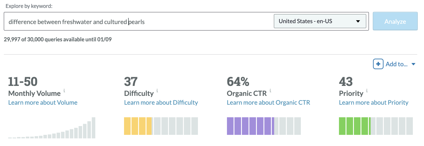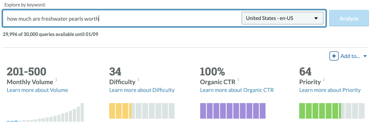 Search volume is the same, but for the keyword how much are freshwater pearls worth Difficulty is up, but so is the overall Priority because the Organic CTR is higher.