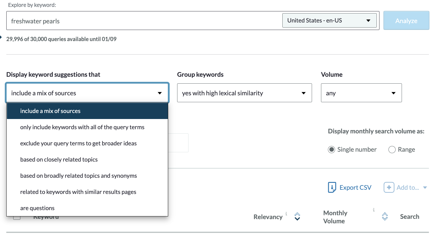Now try "freshwater pearls." As expected, the search volume goes down, but we’re getting more specific.