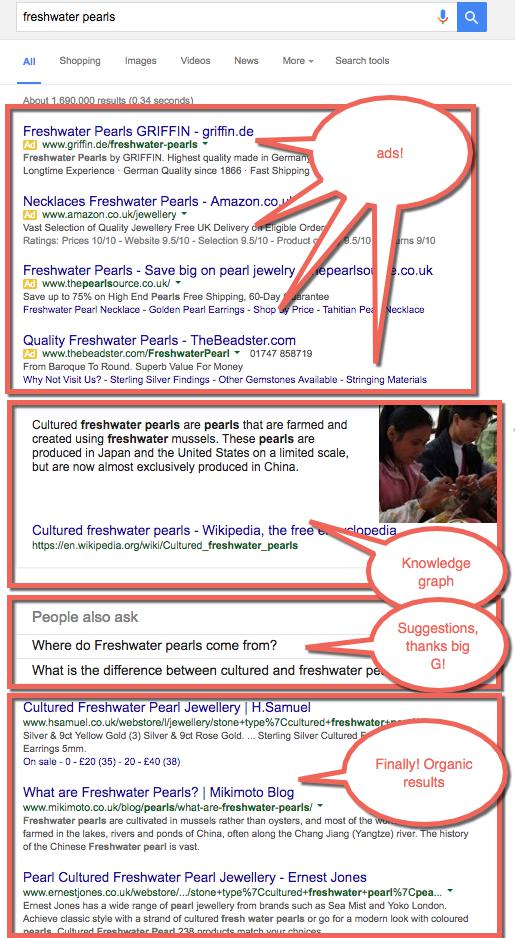 Time to draw on that valuable industry knowledge you’ve been storing up, jot down some ideas, and think about intent and common misconceptions. I’m going to use the example pearls or freshwater pearls in this post as the head term because that’s something I’m interested in.