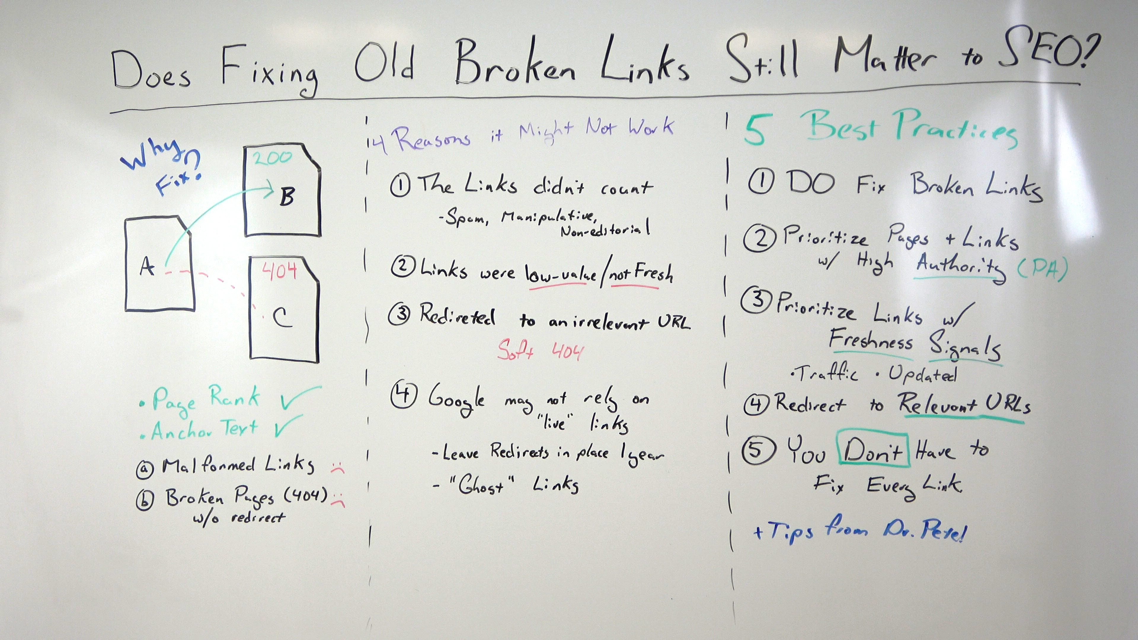 Fixing broken links has long stood as an SEO best practice. But if you've run into situations where you've fixed a broken link and nothing happened, you’re not alone. In today’s episode of Whiteboard Friday, SEO expert Cyrus Shepard discusses whether these fixes still matter, and takes you through steps to increase your chances of seeing the benefits.