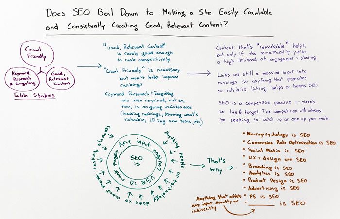 I thought a recent question on Quora phrased it perfectly. This question actually had quite a few people who'd seen it. Does SEO boil down to making a site easily crawlable and consistently creating good, relevant content?