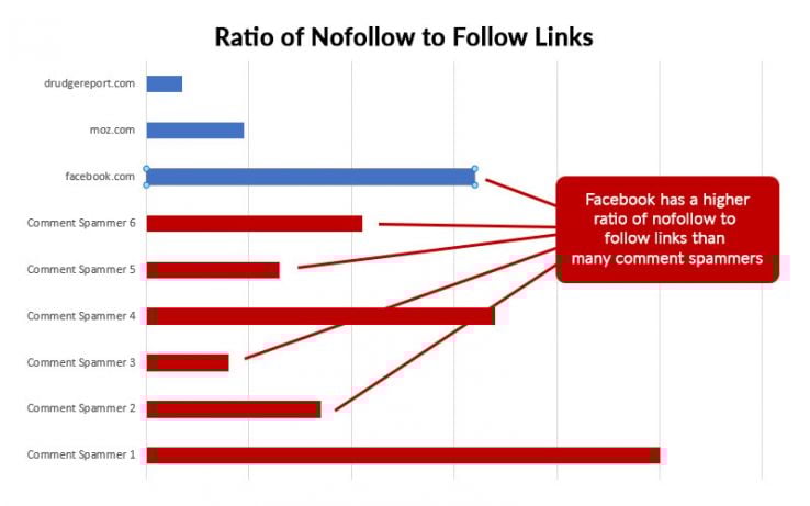 The ratio of nofollow to follow links turns out to be a poor indicator, as popular sites like facebook.com often have a higher ratio than even pure comment spammers. This is likely due to the use of widgets and beacons and the legitimate usage of popular sites like facebook.com in comments across the web. Of course, this isn't always the case. There are some sites with 100% nofollow links and a high number of root linking domains. These anomalies, like "Comment Spammer 1," can be detected quite easily, but as a general measurement the ratio does not serve as a good classifier for spam or ham.