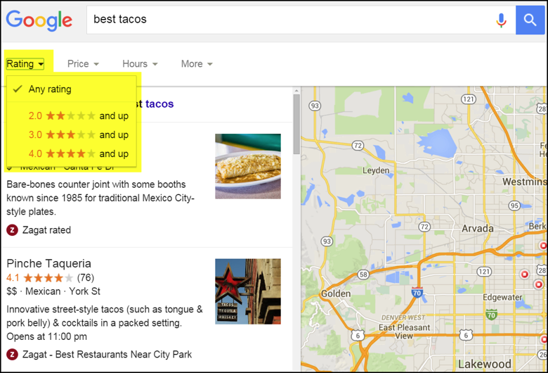 The newish Local Finder results shown below give users the opportunity to sort the results they see by ratings in some verticals. I anticipate that more industries will get this feature in the future, allowing us to choose just how good a local business must be before we’ll consider patronizing it. So, ranking well probably won’t do much for your enterprise unless those rankings are accompanied by ratings that are average (3 stars) at the very least.