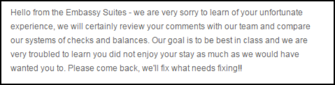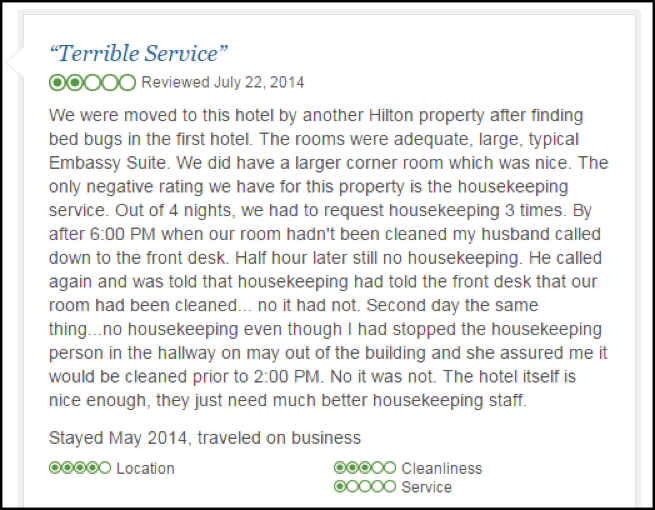 It’s easy to find examples that demonstrate how a business’ refusal to correct deficiencies when they’re brought to the staff’s attention can result in scathing reviews. It’s obviously much better to listen and correct a problem than it is to keep writing apologies for bad service. The hotel referred to in the examples below has dozens of reviews similar to this one commenting on poor experiences with its housekeeping department.