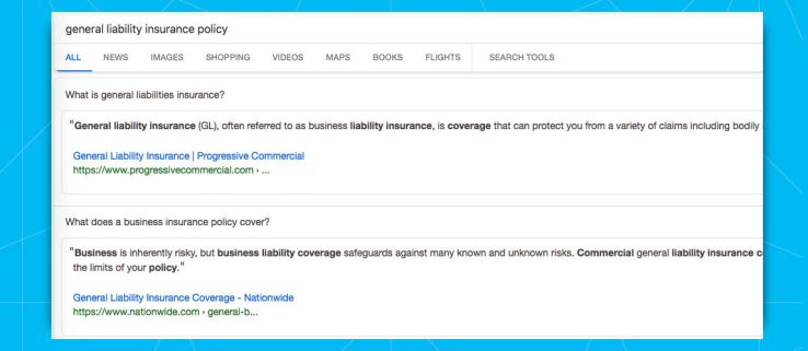 Essentially, without those interrogative words, Google is left to guess what the actual question is. Take our [general liability insurance policy]keyword as an example — does the searcher want to know what a general liability insurance policy is or how to get one?