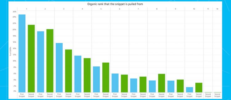 On a single-snippet SERP and ignoring any SERP features, Google pulls from the first organic rank 31 percent of the time. On double-snippet SERPs, the top snippet pulls from the first organic rank 24.84 percent of the time, and the bottom pulls from organic ranks 5–10 more often than solo snippets.